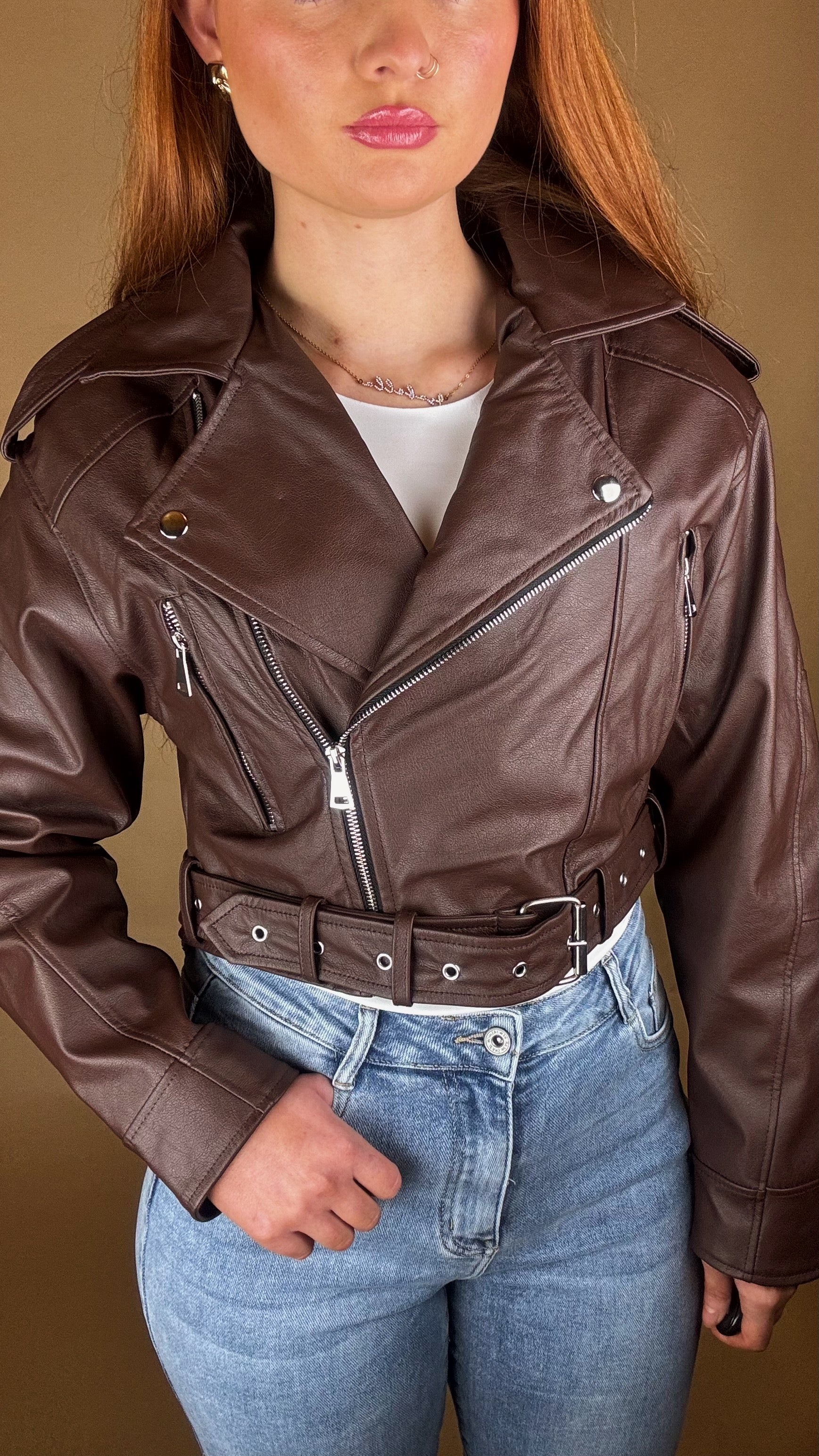 Jade crop Faux Leather Jacket with belt